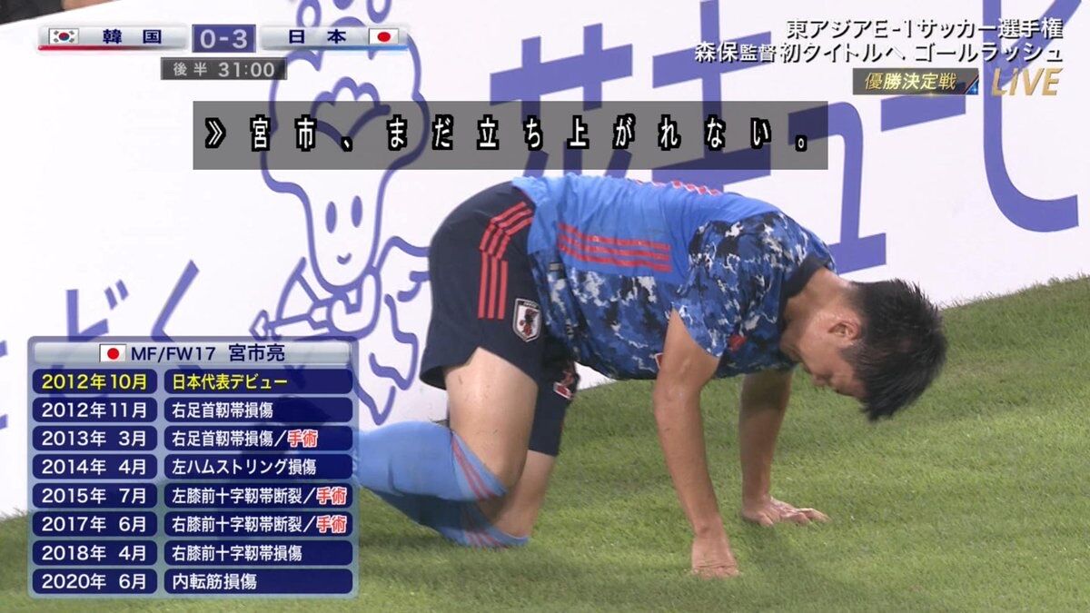 J1横浜F・マリノスは7月29日、日本代表FW宮市亮が右膝前十字靭帯断裂と診断されたと発表した。同選手は27日のE-1選手権・韓国戦で負傷交代しており、近日中に手術の予定となる。